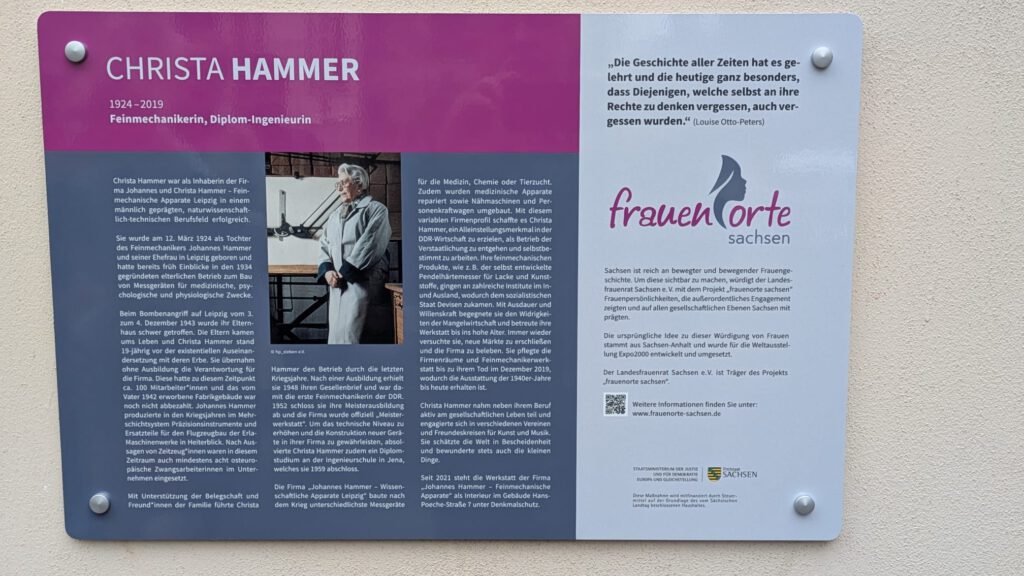 Im Rahmen des Tages des offenen Denkmals wurde am 14. September 2025 die Frauenorte-Tafel für Christa Hammer eingeweiht. Die Tafel erhielt ihren Platz am Gebäude der ehemaligen Werkstatt der Firma Hammer. Neben kurzen Redebeiträgen und einen Vortrag über Christa Hammer hatten die Gäste die Möglichkeit, an einer spannenden Führung durch die ehemaligen Werkstatträume teilzunehmen.